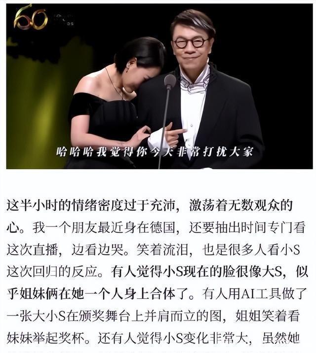 金钟奖颁奖前一早,小S发布动态,缅怀大S称“没人能挑拨”彼此感情,模仿大S口吻感谢蔡康永陪伴,以“今天是S的金钟60”收尾,将自己与姐姐绑定,强调盛会属于姐妹俩。金钟奖缅怀环节包含大S,小S动态与之呼应。蔡康永到场加持,两人台上相遇时紧紧拥抱,小S落泪。颁奖典礼完美落幕后,小S的亮相完成复出预热,每一步显示对回归的重视。 金钟奖结束仅5天后,《三联生活周刊》于2025年10月22日刊登文章,评价小S的坦诚,称“这是第一次,有一个公众人物,在丧失至亲过后不久,如此公开、如此坦诚、如此细致地展示了自己的哀伤”。文章引发网友讨论,有人质疑八个月后看似坦然显得虚伪,有人表示理解,认为公众人物有权表达思念,无需回避。此事件成为焦点,小S的复出迈出第一步,她面对争议保持沉默,努力适应没有姐姐的生活。